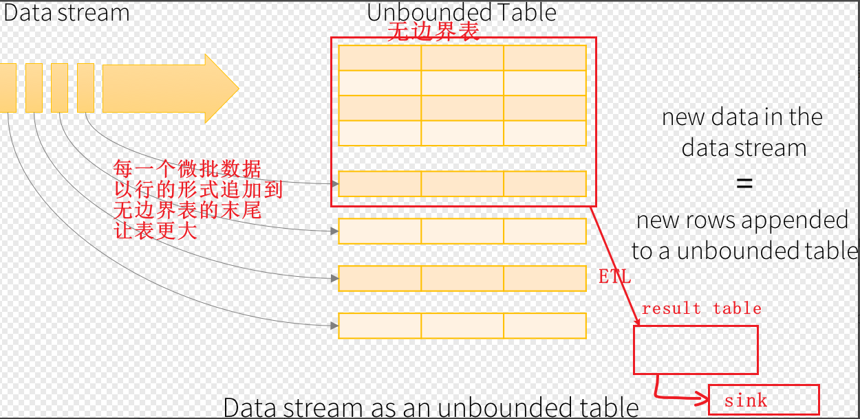 - input table unbounded table无边界表,动态的增加数据,用DataFrame表示