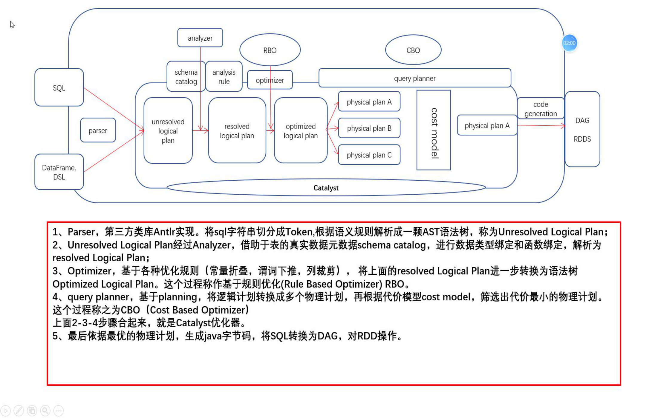 - 支持catalyst,【RBO】基于规则的优化(【常量折叠】,【谓词下推】,【列裁剪】)和【CBO】(基于代价模型的优化)