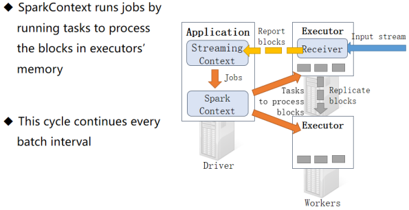 - 每到blockInterval时间间隔,就会生成一个数据块,实时同步备份到其它Executor