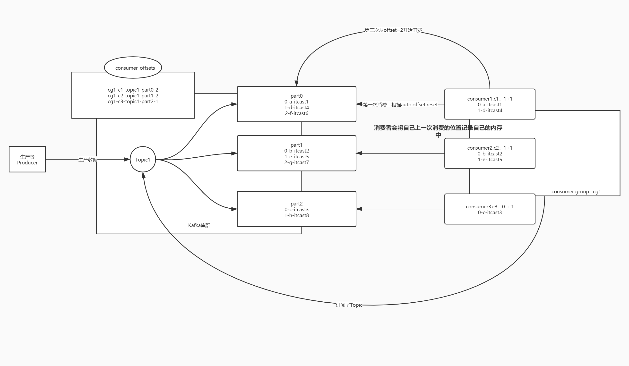 - 保证任何场景下消费者都能知道上一次的Offset
